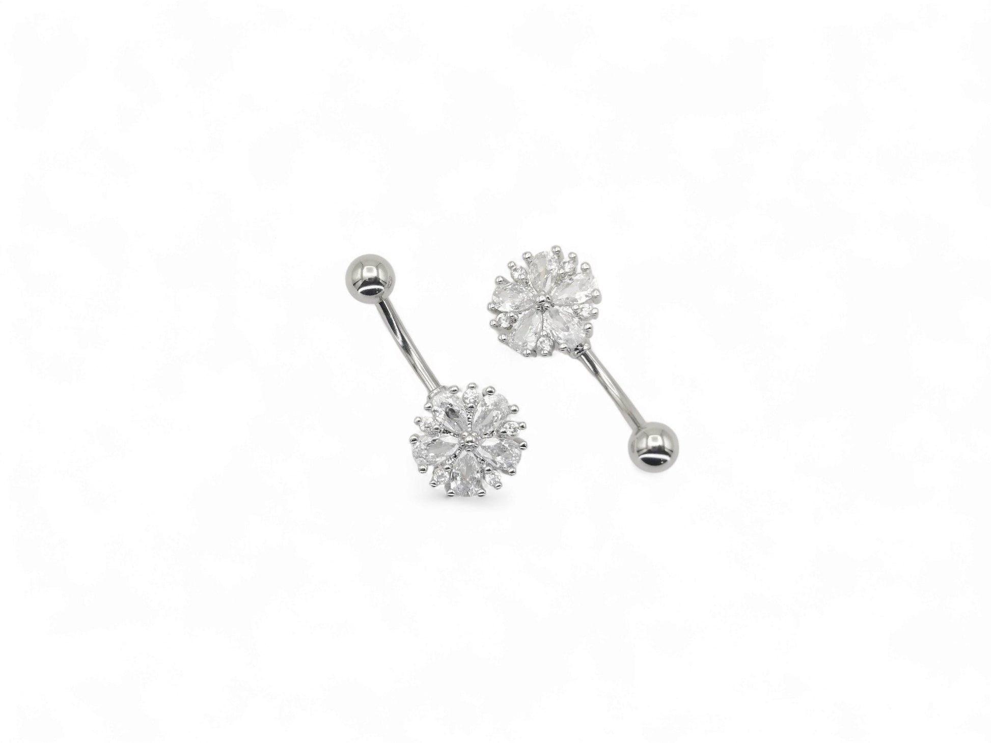 Stunning gem set flower cluster belly bar for 1.6mm/14g x 10mm piercings.