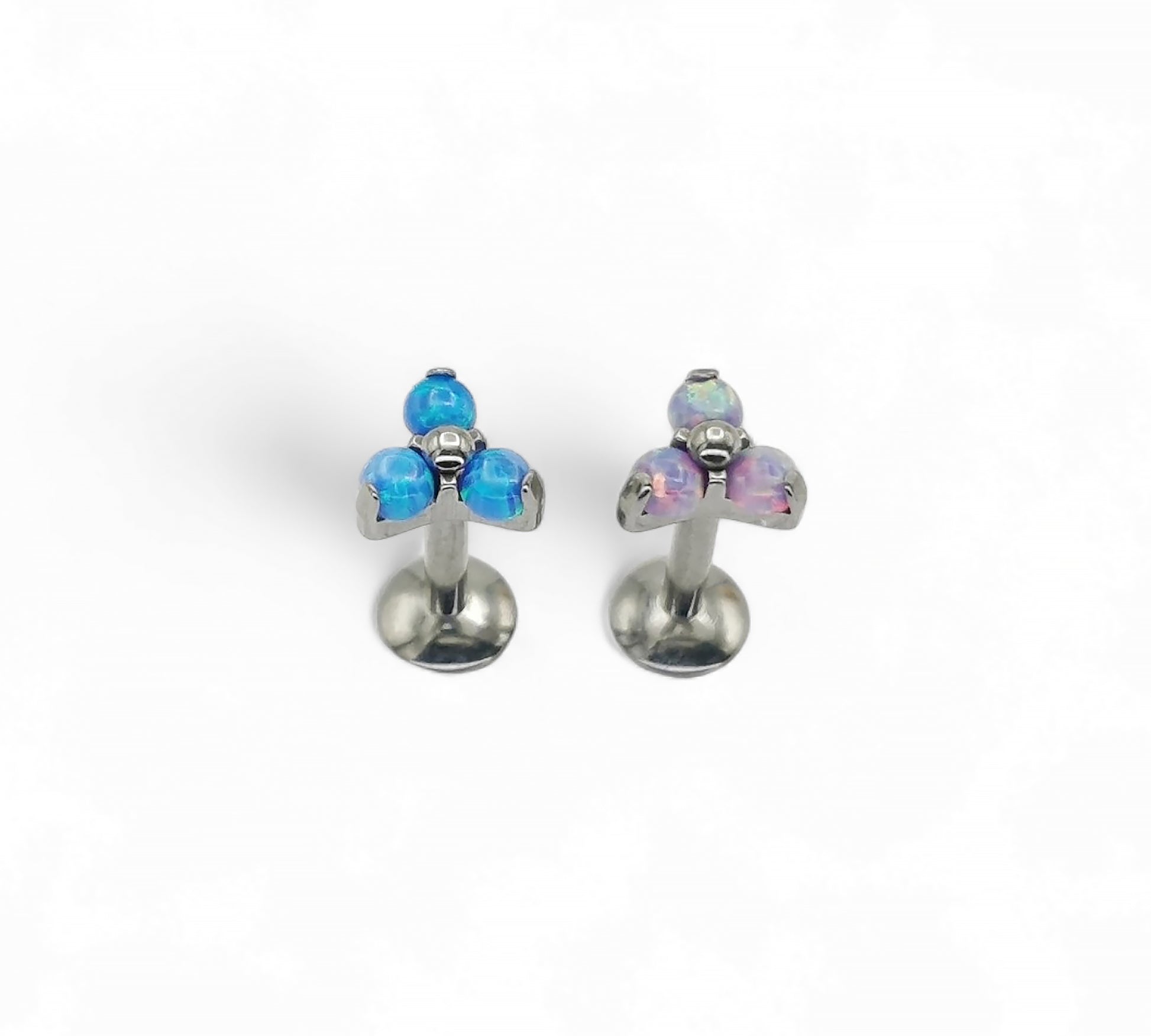 Add a flash of celestial shimmer to your piercings with this G23 titanium opal trinity stud. Featuring three 2mm synthetic opals arranged in a sleek triangular claw setting, this piece offers vibrant colour and secure comfort in one elegant design.